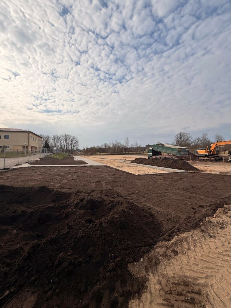 Visus būvdarbus abos objektos veic SIA “KULK”, būvuzraudzību nodrošina SIA “BaltLine Globe”, bet autoruzraudzību īsteno SIA “PBT”. Saskaņā ar noslēgto līgumu un darbu grafiku, abus sporta laukumus plānots pilnībā pabeigt un nodot ekspluatācijā jūnija sākumā.