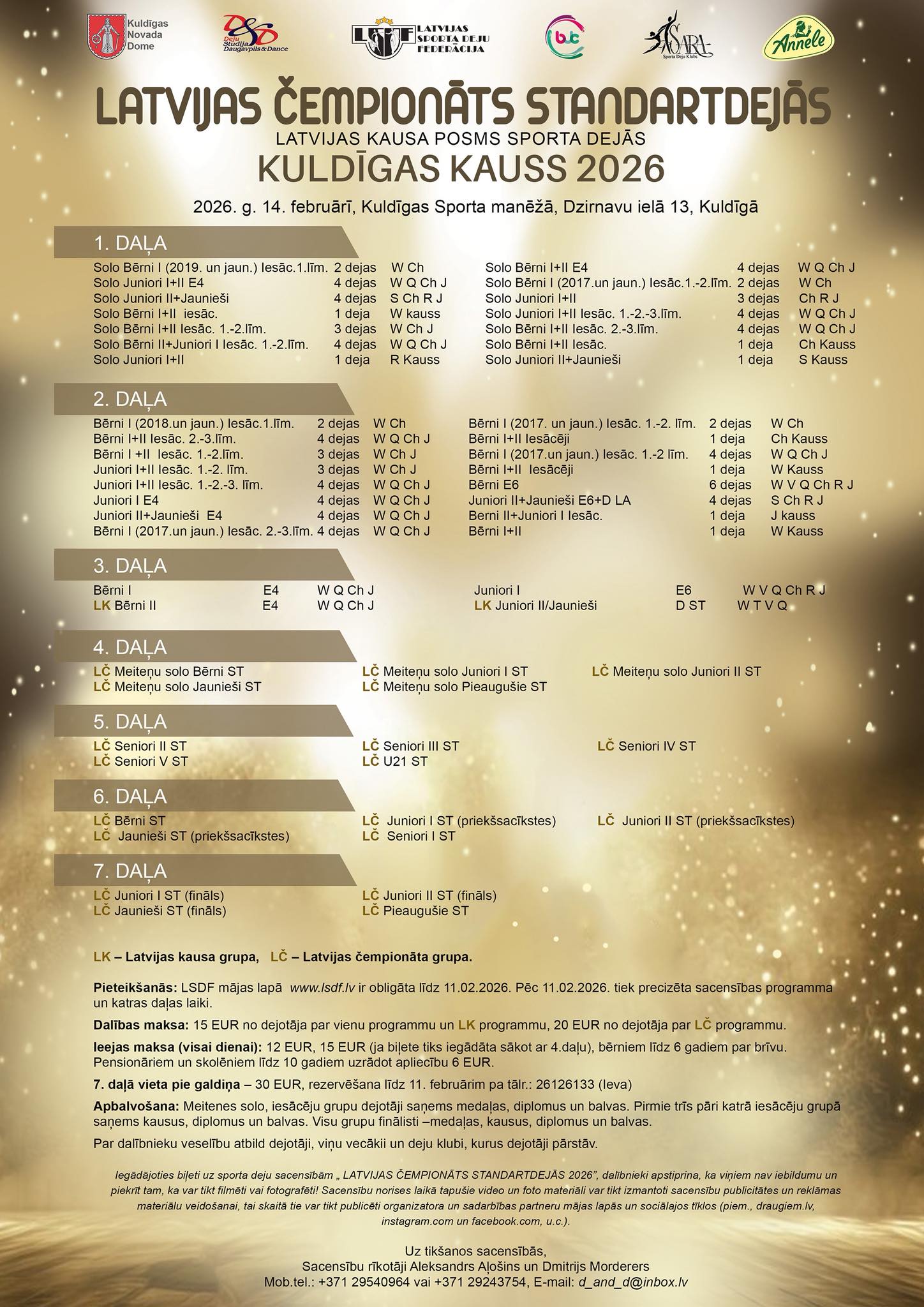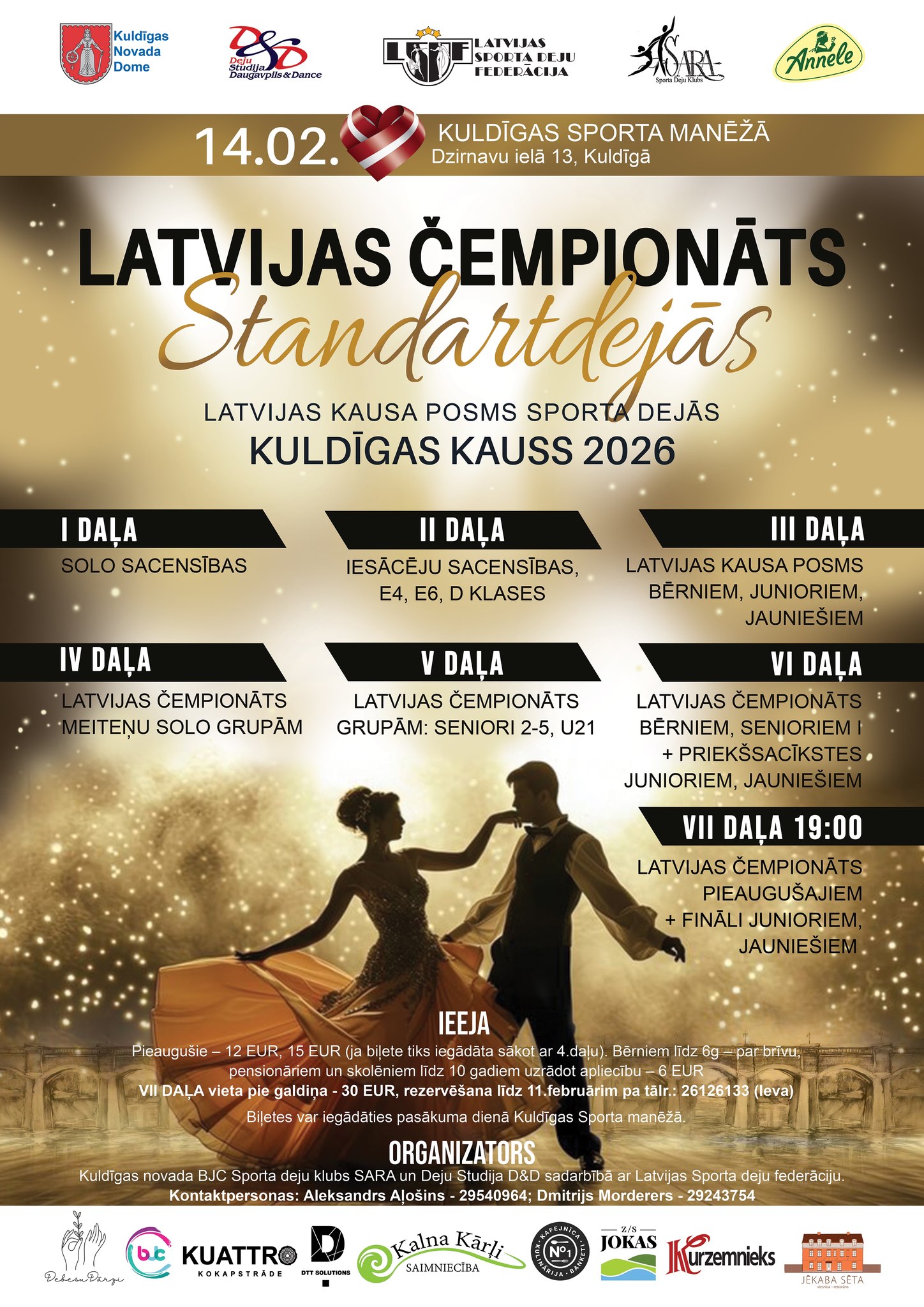 Aicinām ikvienu – dejotājus un līdzjutējus būt klātienē, lai noskaidrotu labākos standartdeju pārus un solo dejotājus pēc starptautisku tiesnešu vērtējuma.